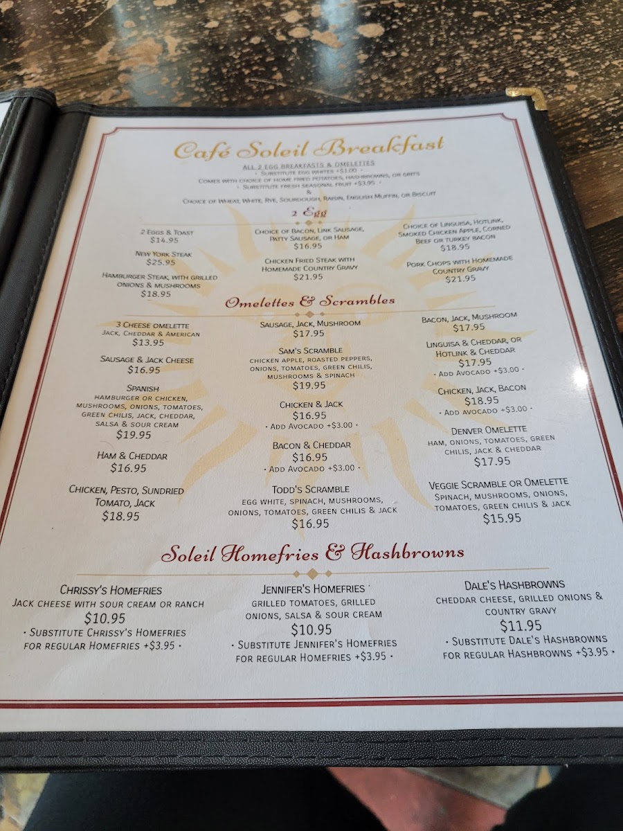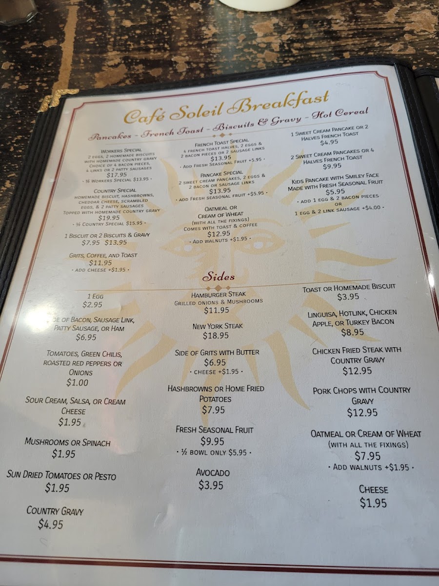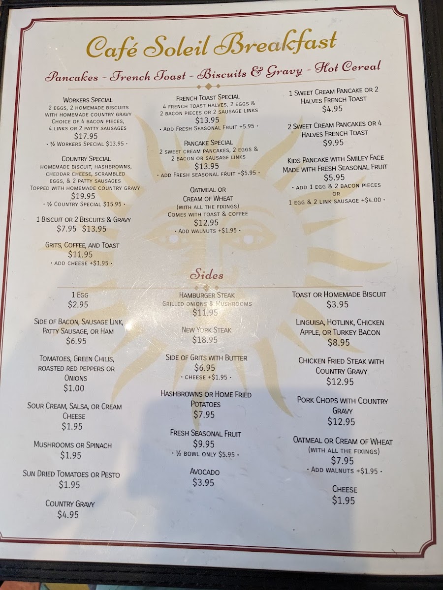 The menu at Cafe Soleil offers a variety of breakfast and casual dining options, available for those seeking a hearty morning meal or a light lunch. The menu is organized into several groups to accommodate different tastes and dietary preferences.