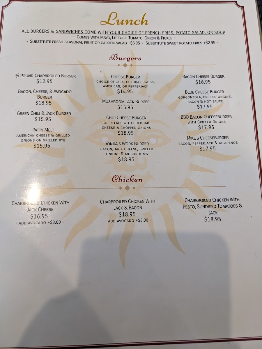 Vegan Options: The menu includes several vegan-friendly choices such as vegan Joe’s scramble, Impossible meat burgers, vegan BLTs, grilled portabella mushroom and eggplant sandwiches, and avocado sandwiches, catering to plant-based dietary needs.